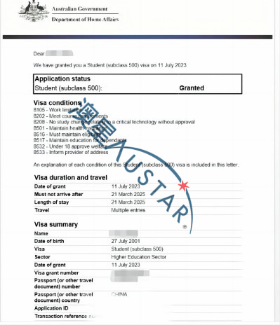 大四學業結束后,楊同學于2023年6月30日才拿到學士學位證,而碩士開學的時間是7月31日,時間非常緊迫。我們火速幫他上傳了補件資料。在7月5日收到了悉尼大學的正式錄取信,并于當天交了學費。隨后我們就開始準備簽證所需要的資料及所有文件翻譯。在7月11日收到學校的COE當天, 我們就為楊同學遞交了簽證申請,并于當天晚上收到了簽證批準信!史無前例,絕對的神速!總體來說申請過程非常順利,家長和學生都很開心,這樣就有充足的時間做行前準備了。